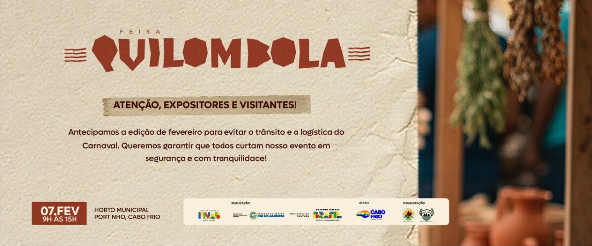 A tradicional Feira Quilombola, que ocorre mensalmente no segundo sábado de cada mês, terá sua edição de fevereiro antecipada. O evento será realizado no próximo sábado, dia 7 de fevereiro, a partir das 9h, no Horto Municipal. A alteração no calendário foi motivada pela programação de Carnaval, visando garantir que expositores e visitantes tenham melhores… Feira Quilombola de Cabo Frio terá edição antecipada em fevereiro