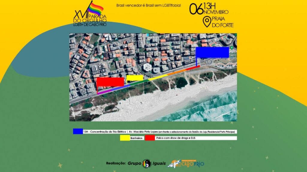 Para garantir mais comodidade e segurança ao público, o percurso da 17ª Parada do Orgulho LGBTI+ de Cabo Frio, que vai acontecer no próximo domingo (6), foi alterado. O local continua sendo a Praia do Forte, mas a concentração será transferida para a Avenida Litorânea, na altura do Residencial Porto Príncipe, no bairro Algodoal. De lá, o trio elétrico vai seguir até o palco, montado na direção da Rua Ramon Pereló Filho, no Braga.