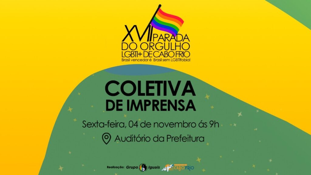 A Prefeitura de Cabo Frio convida os veículos de comunicação para uma coletiva de imprensa, nesta sexta-feira (4), às 9h, na sede do Governo Municipal, sobre a 17ª Parada do Orgulho LGBTI+. Na ocasião serão informados detalhes sobre o esquema de trânsito e segurança, estrutura e programação, entre outros temas relacionados ao evento do próximo domingo (6) na orla da Praia do Forte.
