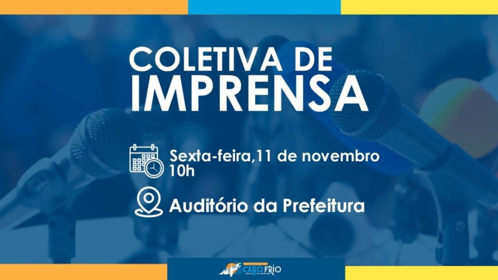 A Prefeitura de Cabo Frio convida os veículos de comunicação para uma Coletiva de Imprensa, nesta sexta-feira (11), às 10h, no auditório da sede do Executivo. Na ocasião, o prefeito José Bonifácio irá apresentar o novo secretário de Obras e Serviços Públicos. Solicitamos aos veículos de comunicação a confirmação da presença até às 20h desta […]