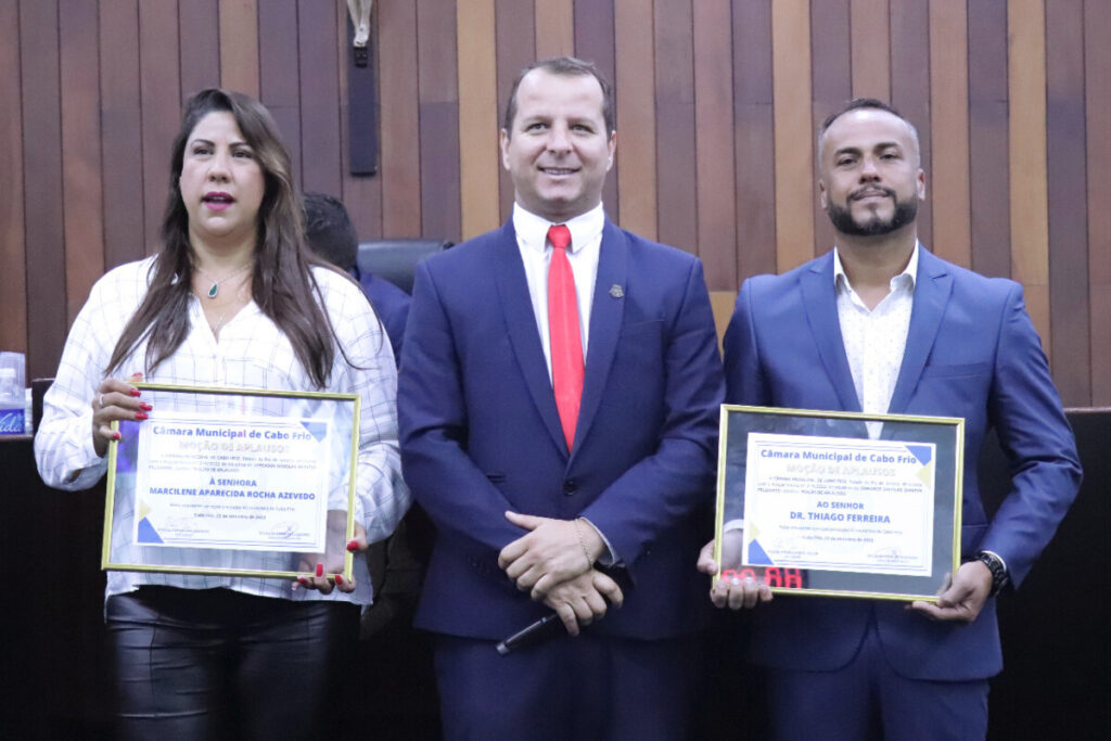 O diretor médico, Thiago Ferreira; e a diretora administrativa, Marcilene Azevedo, ambos da Unidade de Pronto Atendimento (UPA) do Parque Burle, receberam uma moção de aplausos durante a sessão na Câmara Municipal de Cabo Frio nesta terça-feira (8).