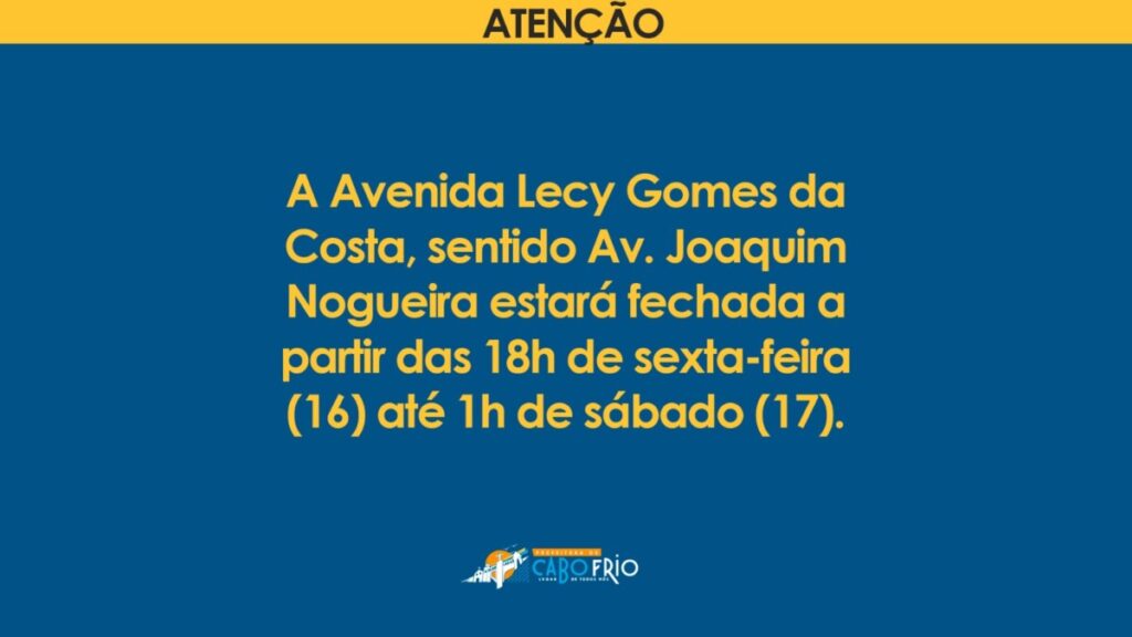 Avenida Lecy Gomes da Costa, sentido Avenida Joaquim Nogueira, será fechada a partir das 18h desta sexta-feira (16) Os motoristas que circularem pelo bairro São Cristóvão, em Cabo Frio, devem ficar atentos às alterações no trânsito, por conta do show do cantor gospel Fernandinho. A partir das 18h desta sexta-feira (16), a Avenida Lecy Gomes […]