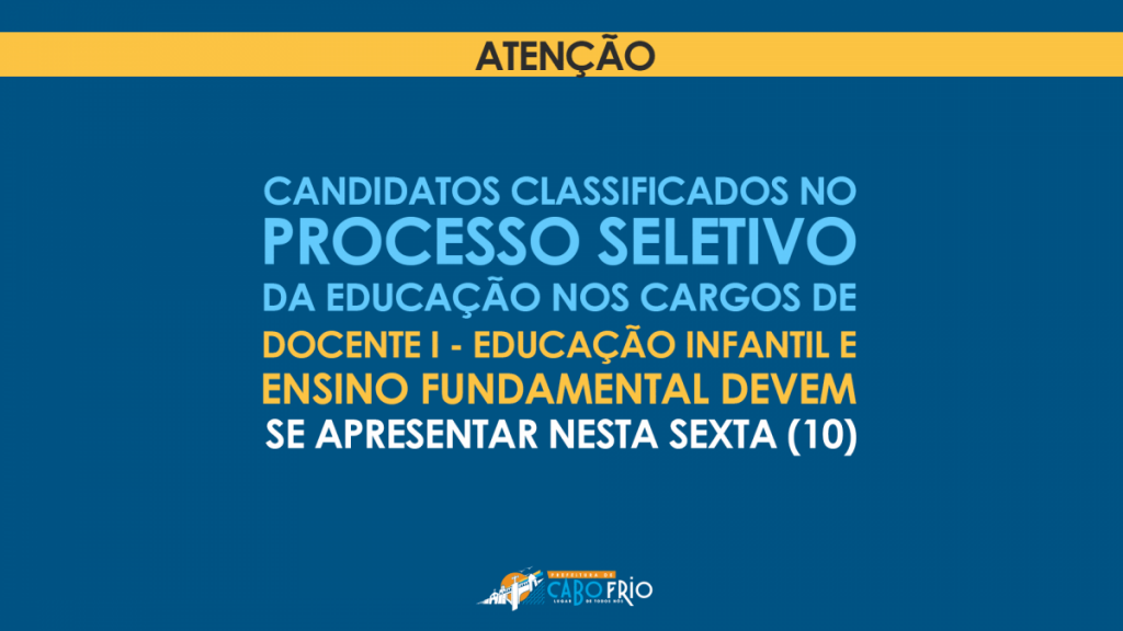 Os candidatos classificados para o cargo de Docente I (Educação Infantil e Ensino Fundamental) no Processo Seletivo Simplificado da Secretaria de Educação de Cabo Frio, estão convocados para escolha da escola onde exercerão a função. Os profissionais devem se apresentar na Escola Municipal Edilson Duarte, seguindo a ordem de classificação, nesta sexta-feira (10), das 9h […]