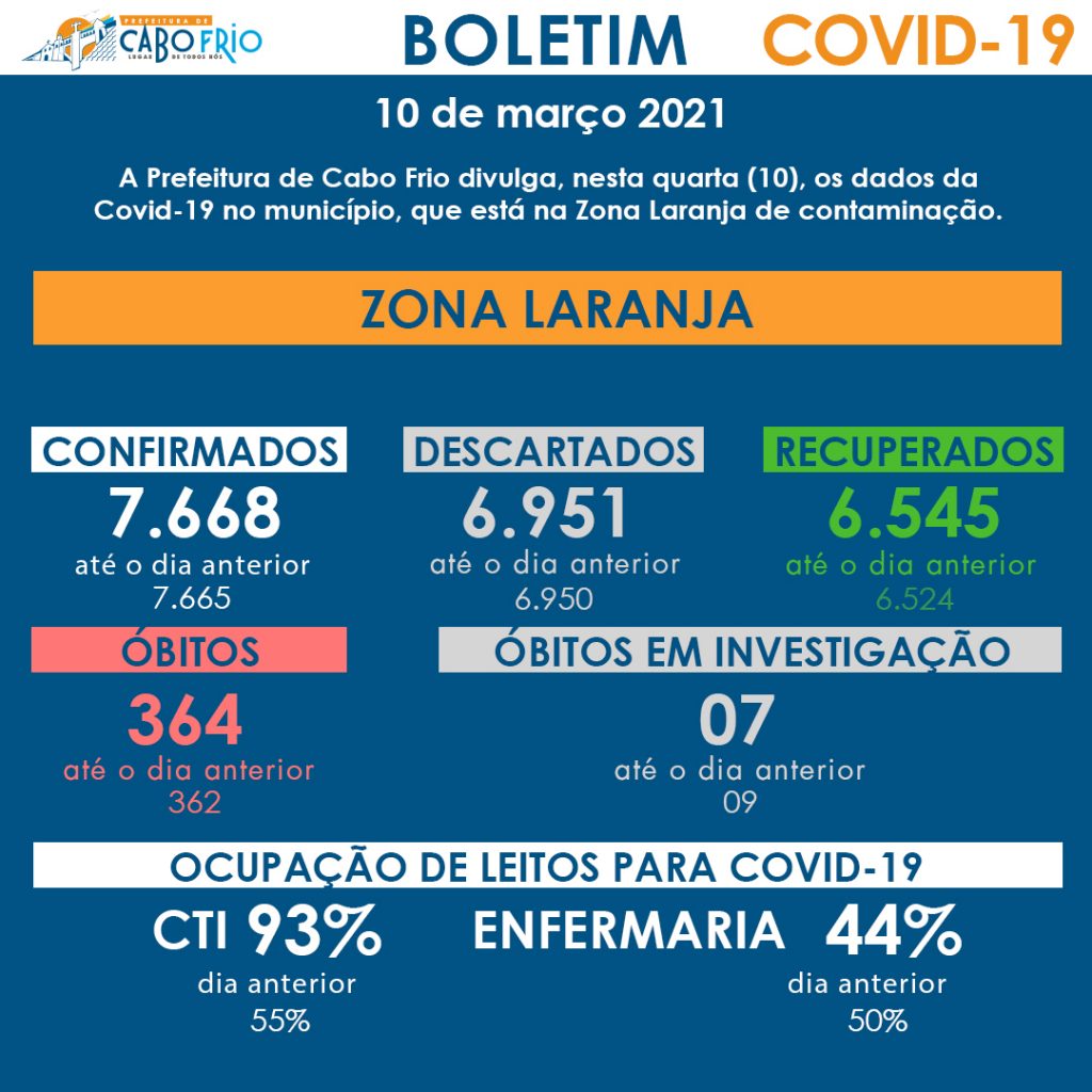 A Prefeitura de Cabo Frio divulga, nesta quarta (10), os dados da Covid-19 no município, que está na Zona Laranja de contaminação. Até o momento são: