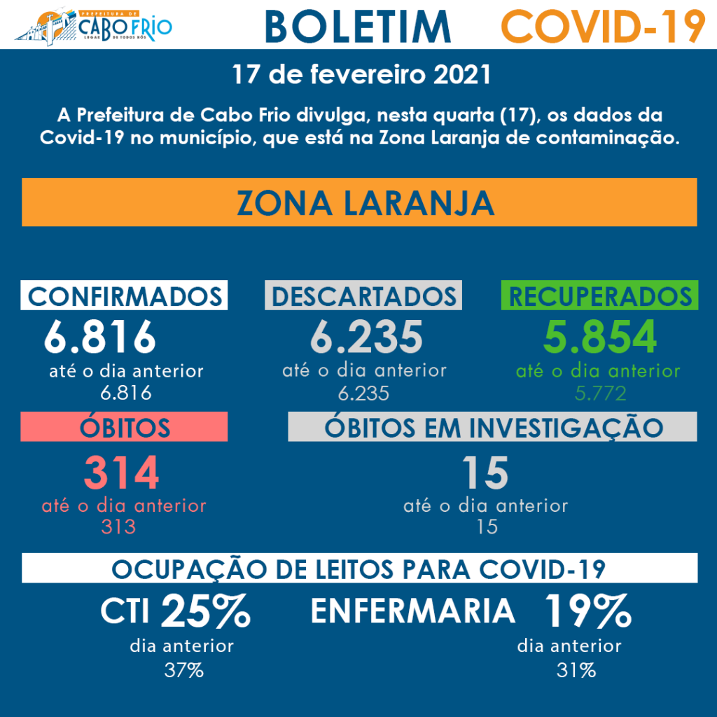 A Prefeitura de Cabo Frio divulga, nesta quarta (17), os dados da Covid-19 no município, que está na Zona Laranja de contaminação. Até o momento são: