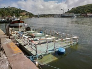 Agentes da Guarda Marítima e Ambiental acompanham desde domingo (19) a operação de retirada da balsa “Marisco” do fundo do Canal do Itajuru. A embarcação submergiu com a força das fortes chuvas que caíram nos últimos dias.